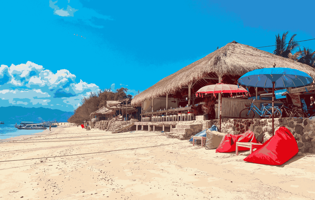 With fewer visitors, quieter shores, and well-preserved coral reefs, Gili Meno offers a more tranquil swimming experience — often with sea turtles and tropical fish visible directly from the beach.